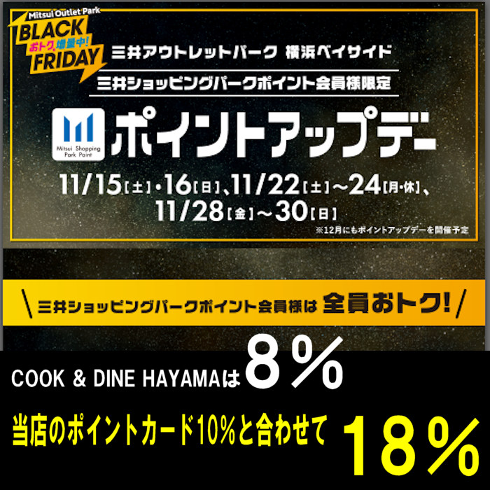 さらに、COOK & DINE HAYAMAで三井ショッピングカードセゾンでお買い上げの場合、3%プラスの8%がプラス。
