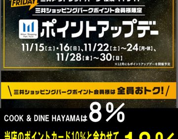 こんにちは。COOK & DINE HAYAMA・鉄鍋伝道師の山口です。 11/22(土)~30(日)の9日間、ポイント10倍フェアを開催致します。 ...(続きを読む) -