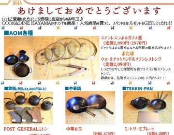 こんにちは。COOK & DINE HAYAMA・鉄鍋伝道師の山口です。 2025年、本年も多くのお客様にご来店頂きました。スタッフ一同心より感謝申し上げます。 2026年の初売りは、本年開催して大好評だった「大盤振る舞い」を再び!! COOK & DINE HAYAMAの定番人気アイテムに、豪華なオマケをつけちゃいます♪...(続きを読む) -