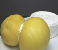 「カチョカバロ」(カチョカヴァロ) この奇妙な名前は・・・・「カチョ」はトスカーナや南イタリアではチーズを意味する言葉で、 「カヴァロ」は馬を意味するそうです。この独特の形状が馬の背に乗せた荷物の袋に似ているところから 付いたようです。製法は、熱湯の中でカード(固形分)を整形しながら引き伸ばし、 棒につるして熟成させます。整形に大変手間がかかります。 粘土のような独特の弾力は癖になる食感。とても穏やかな 味わい。加熱するとやわらかくなって糸を引くようになりますので 流れ出ない程度に加熱してパンやポテトにのせて食べると感涙モノです。 よく熟成させた場合は、おろしていろんな料理に使っても◎。