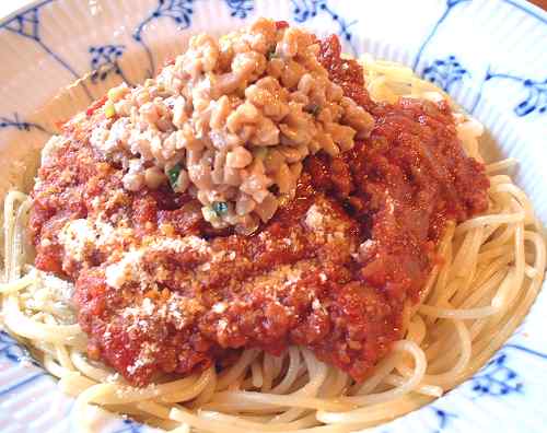 ミートソースの上に、少なめの醤油と刻みねぎを入れてよくかき混ぜた納豆を乗せます。「え゛〜っ?!」とお思いになるかもしれませんが、これが旨いんです。ミートソースとよくかき混ぜてどうぞ〜。